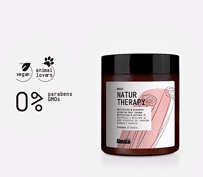 Hiusten ja päänahan hoito. Naamio Natur Therapy- kaneli (luonollinen yhdiste). Korjaava naamio heikoille ja hennoille hiuksille. Estää hapettumista, antaa kosteutta ja pehmeyttä, antioksidantti, kontroloi talirauhasta, tanniinit (muodostaa suojakalvon ),lLaita keskelle päätä ja levitä jureistä latvoihin.